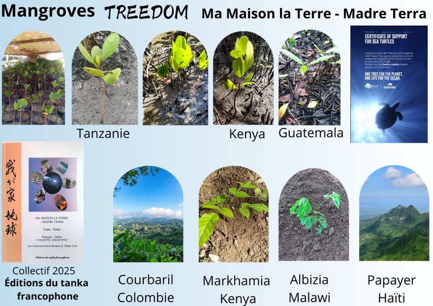 en cliquant sur le lien : Ma maison la Terre – Madre Terra Tanka . HaikuPour fêter la sortie du recueil, nous avons financé la plantation d'un palétuvier des mangroves en bordure de l’océan Indien, en Tanzanie, qui inclut une donation pour soutenir le centre Plastic Free, pour la récupération des tortues marines menacées par la pollution plastique. Ceci par l'intermédiaire de l'entreprise toscane Treedom qui donne des nouvelles lors des premières phases de croissance des arbres.