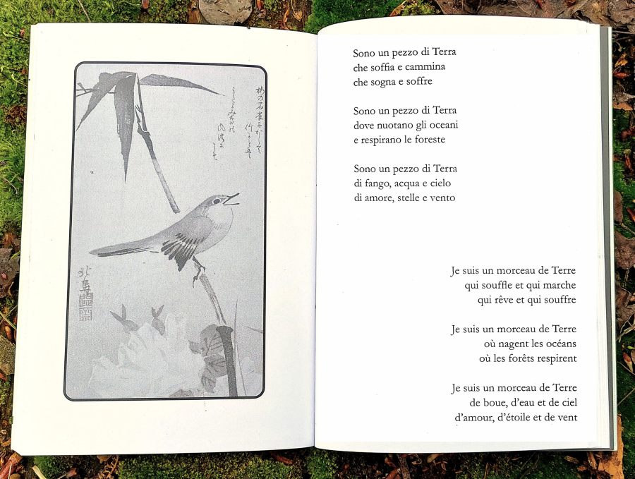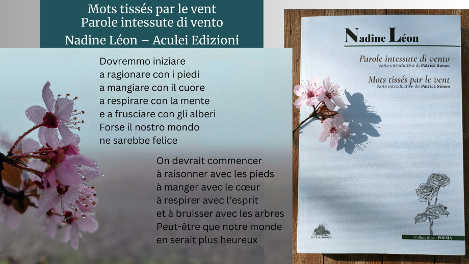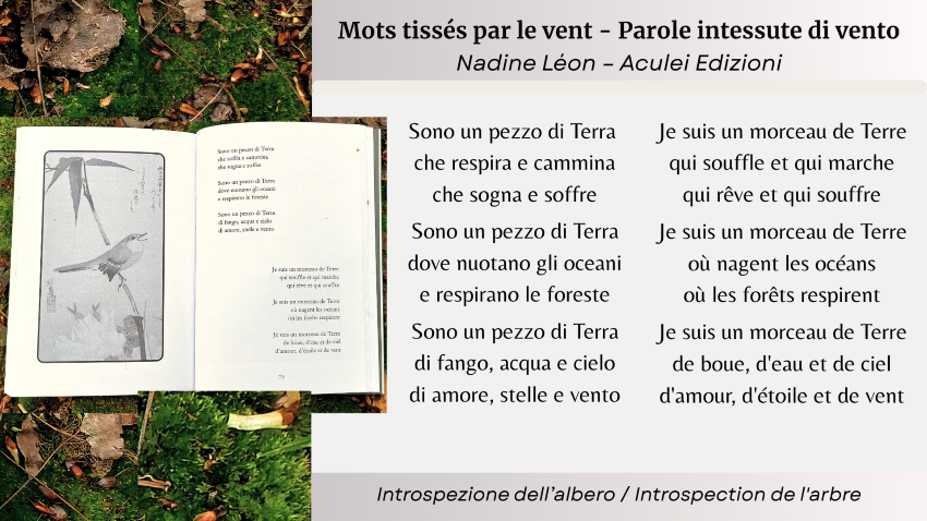 Parallèlement, le recueil s'ouvre sans cesse sur le cosmos. Étoiles, galaxies, matière primordiale et poussière de lumière se rencontrent dans les compositions. Ces éléments ne forment pas seulement une toile de fond métaphysique, mais deviennent la mesure de l'humanité. Chaque atome qui nous compose renvoie à une généalogie cosmique. Le microcosme de l'expérience individuelle et l'immensité de l'univers ne sont pas deux plans distincts, mais deux aspects d'un même souffle. La poésie de Léon devient ainsi un lieu de reconnexion, une forme de conscience ontologique. À ce stade, il est important de rappeler le choix du bilinguisme, italien et français, et de souligner qu'il ne s'agit en aucun cas d'un simple accessoire. Les deux langues coexistent comme deux courants d'air traversant un même espace. Non pas une simple traduction, donc, mais un dialogue continu : le rythme change, la sonorité se transforme, certaines images sont accentuées, d'autres s'estompent. Le lecteur est invité à une expérience de parcours, une lecture qui ne se déroule pas en ligne droite, mais par retours, décalages et variations.